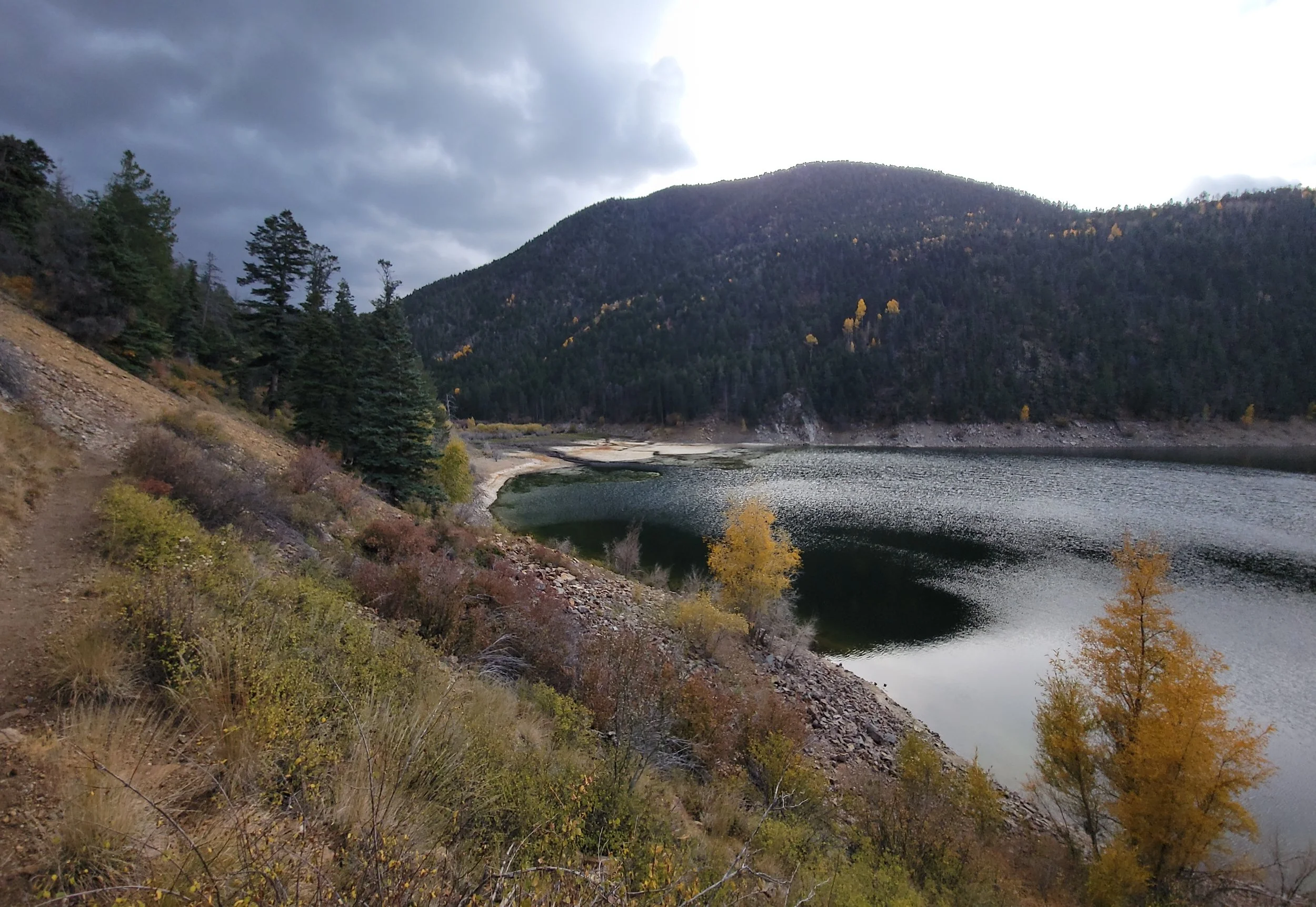 Upon arriving back at the Xterra, I carefully secured my gear to the homemade rack system and quickly changed out of my wet clothes. Just then, some side-by-side riders pulled up nearby. They asked me how the fishing was and shared that late spring fishing is their favorite time to fish the lake. During this season, the weather is warmer, bugs are more plentiful, and the fish tend to be more active than other times of the year. Additionally, because the lake fills with water in late spring, they can easily launch small kayaks right from the shore, giving them access to fish along the east side of Cabresto Lake. Meanwhile, the clouds were growing thicker overhead and the air was cooling rapidly, so I mentioned that I needed to find a suitable camp spot for the night. They recommended the Rio Grande BLM site just northwest of Questa as a great option. After thanking them for the friendly chat, we parted ways and I began my descent down the mountain.
