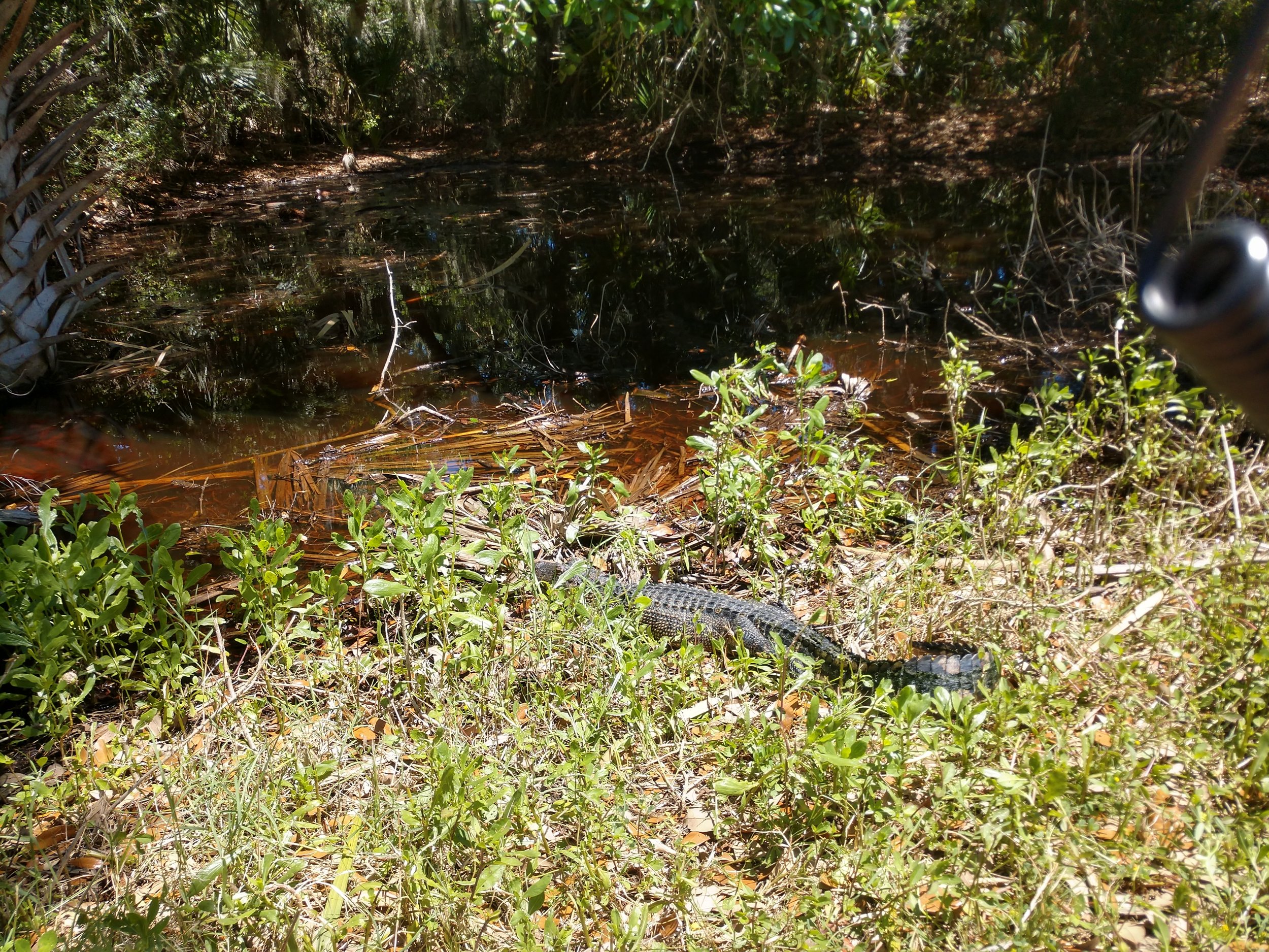 As I walked carelessly down the trail, wearing nothing but my trusty flip flops and carrying my fly fishing gear, I could feel the humidity and temperature rising quickly in the thick spring air. According to the map, I was about to enter a much-welcomed tree canopy that would shield me from the harsh, direct sun beating down on my skin. The path ahead was dotted with a few muddy, swampy patches that I had to carefully navigate, and it was exactly at that moment I encountered Mr. Gator. About half an hour into the walk, I spotted the first alligator of the day, lazily basking in the dappled, indirect sunlight beneath a large tree, perfectly camouflaged against the murky backdrop. My senses immediately heightened, every sound and movement around me amplified as I cautiously made my way toward the end of the trail, fully aware of the wildness that surrounded me.