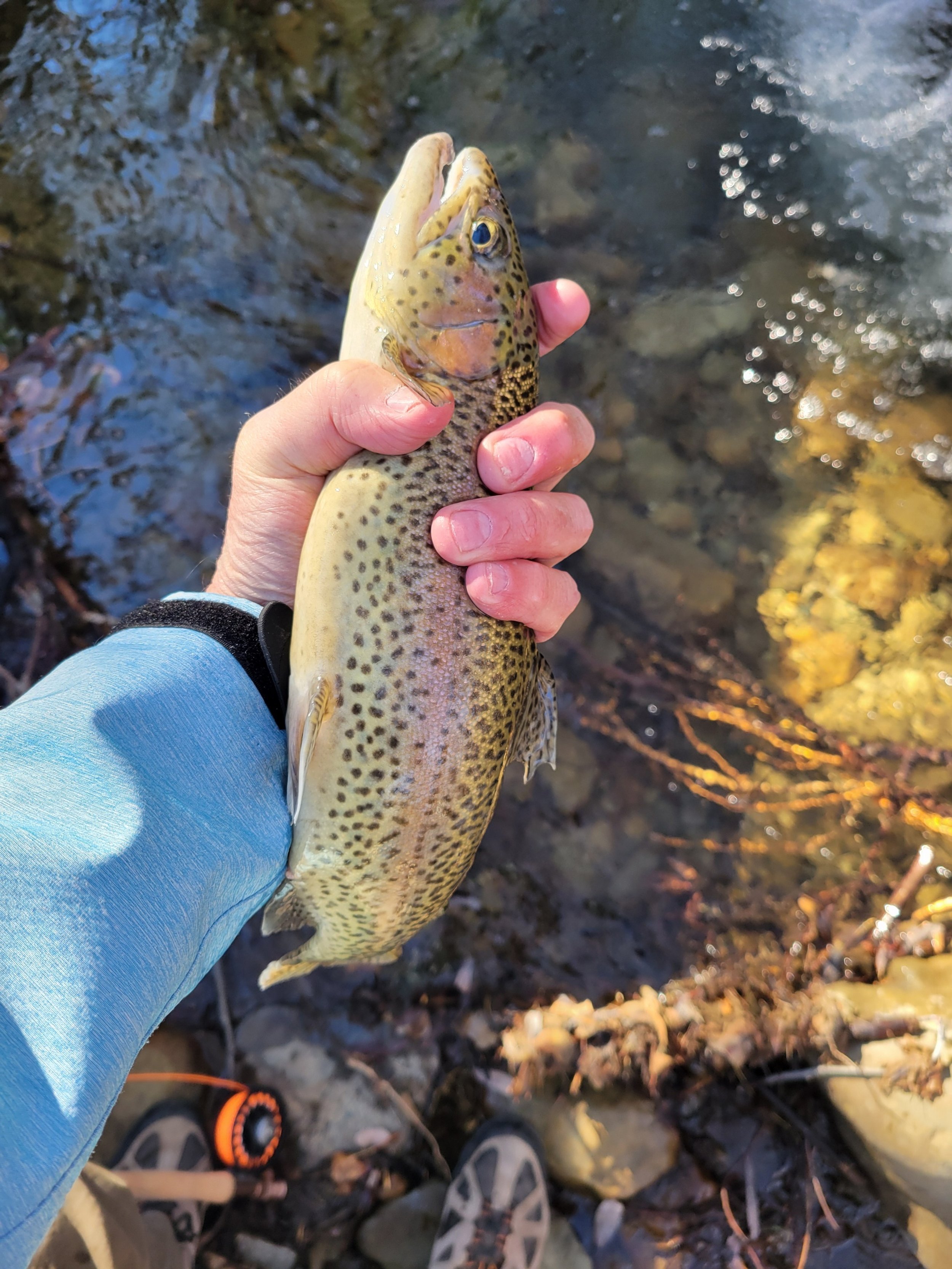 There were plenty of “long Distance Releases,” with the trout eagerly spitting out the size 14 caddis flies. It was clear that it was time to downsize my approach, switching to a more delicate size 18 pattern. That subtle change was the trick that unlocked the day’s success! I ended up landing 8 vibrant rainbow trout, ranging in size from 6 to 14 inches, each one putting up a spirited fight that made the effort all the more rewarding.